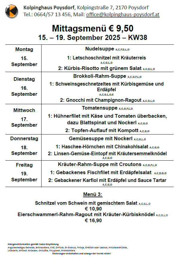 Samstag, Sonntag sowie an Feiertagen bleibt unsere Gastronomie geschlossen. Für Reservierungen und Veranstaltungen stehen wir Ihnen jedoch gerne auch am Wochenende zur Verfügung – sowohl direkt im Kolpinghaus Poysdorf als auch bei Caterings außer Haus.